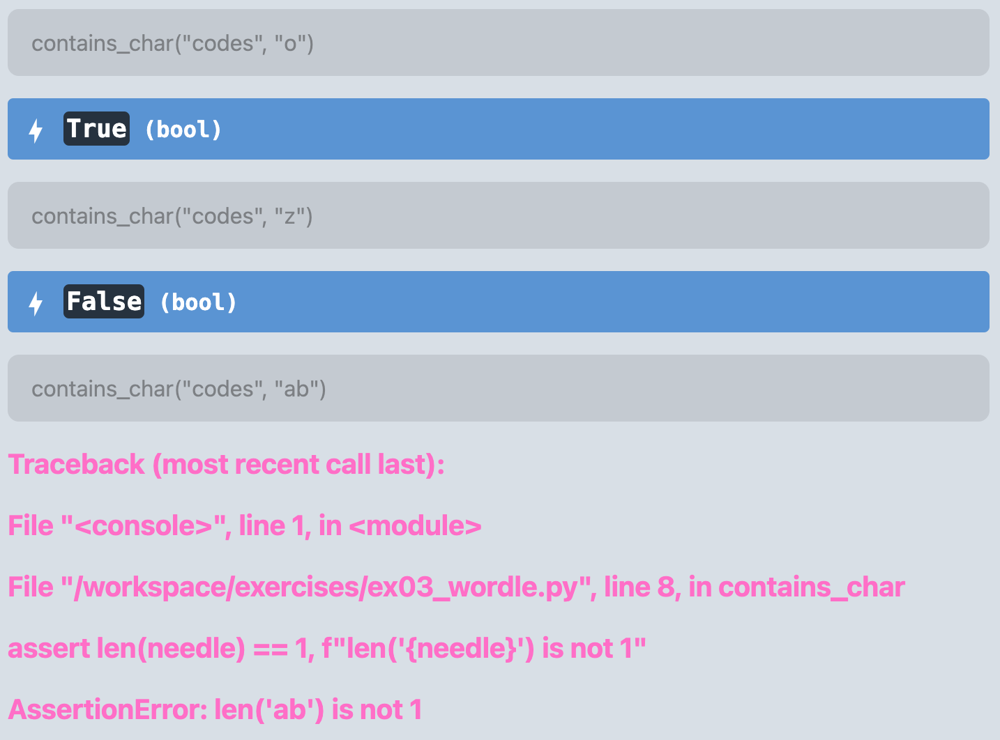 Once you have your main function and game loop working, there’s only one bit of icing left to add to your delicious code cake. We will fully explain what is going on in the following code snippet soon, but for now note that this is an idiom common to Python programs like the one you have written. We will learn it does two things: 1. it makes it possible to run your Python program as a module (if you tried python -m exercises.ex02_wordle right now you would see nothing happens), and 2. it makes it possible for other modules to import your functions and reuse them. Add the following snippet of code as the last 2 lines of your program (notice, there are two underscores on both sides of the words name and main):