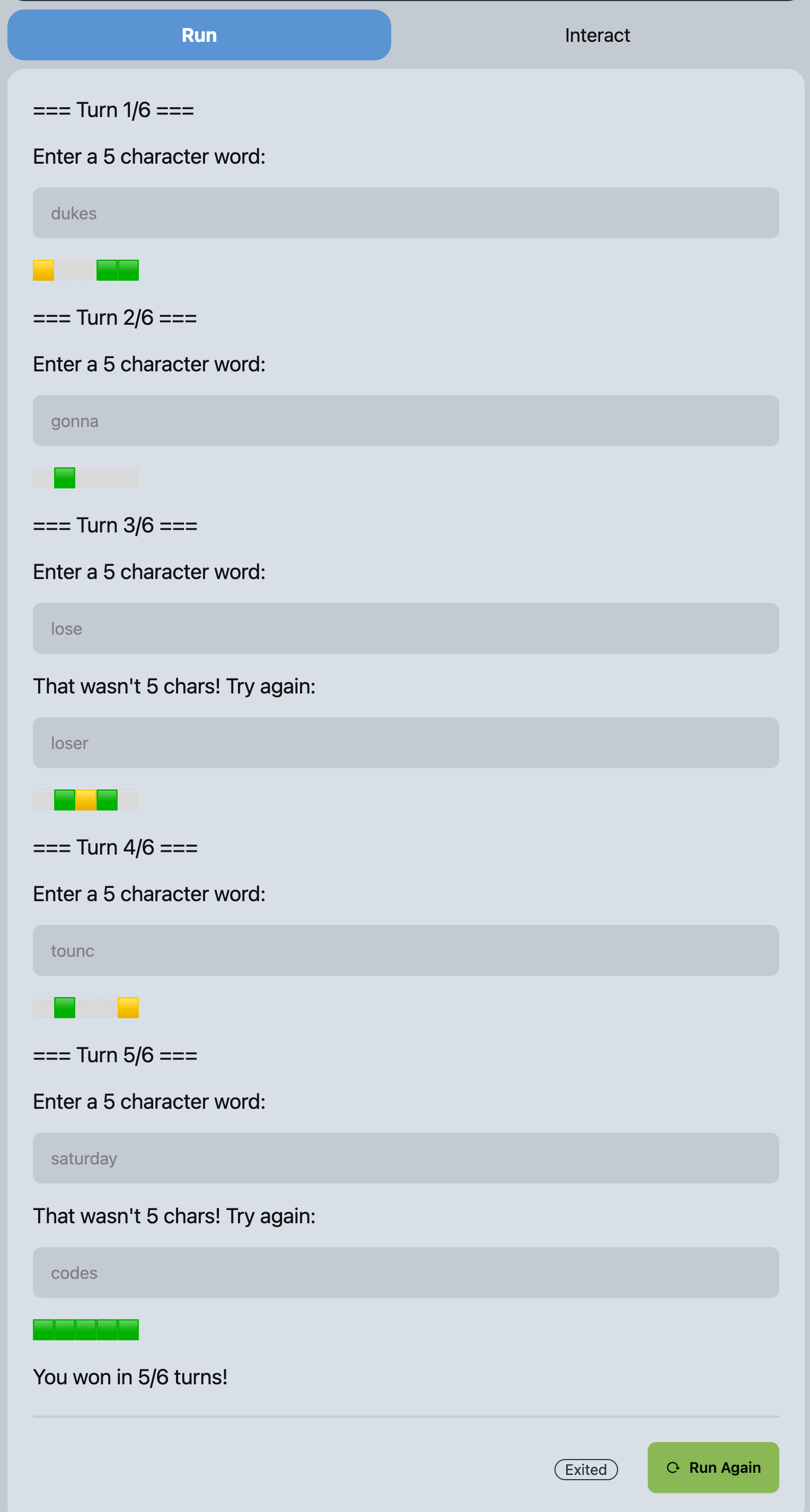 After the game loop, if the user won, print You won in N/6 turns! where N is replaced with the number of guesses it took to get the word. Otherwise, when the user does not guess the word in 6 or fewer guesses, print the following message: X/6 - Sorry, try again tomorrow! where X is literally the character X.
