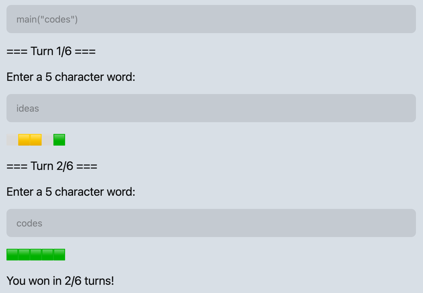 input_guessto obtain a guess of the correct length. - Codify the emoji results of the user’s guess versus the secret by making use of your