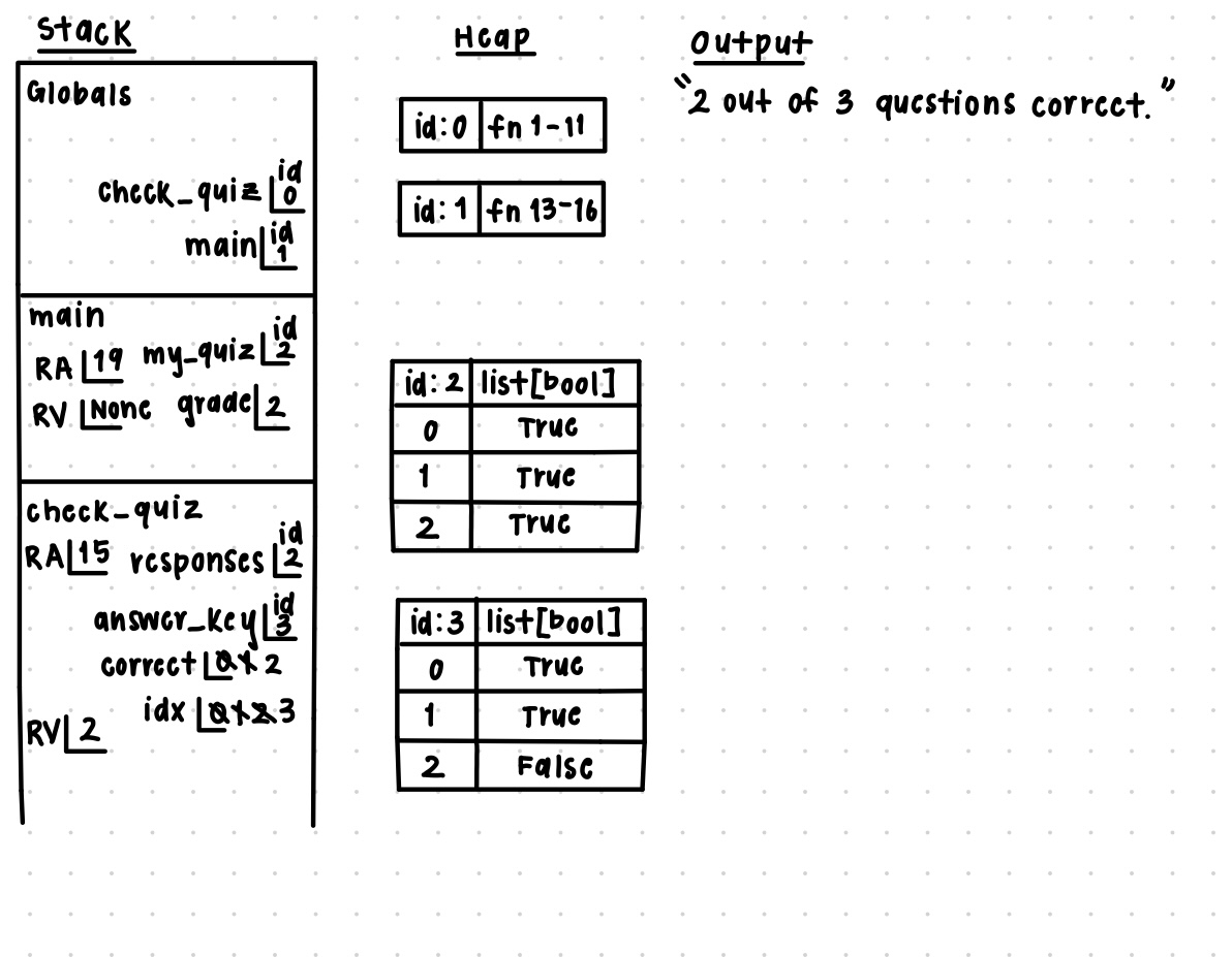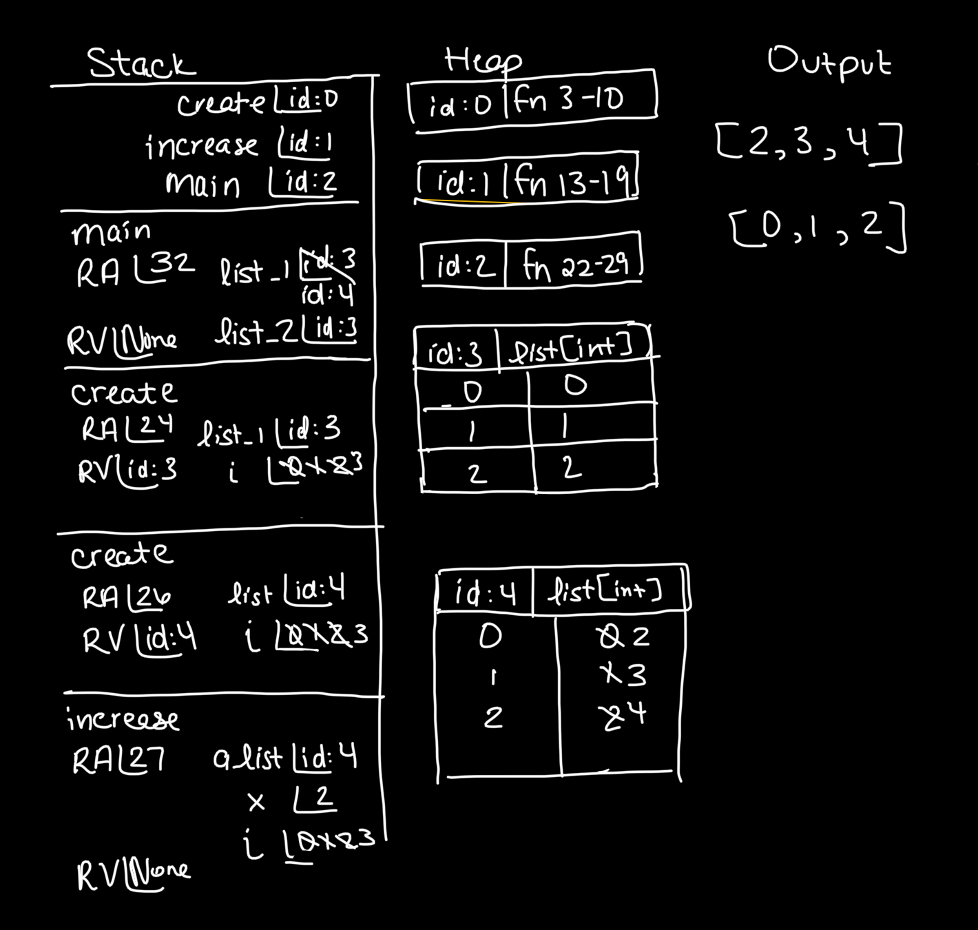 Image Description: The memory diagram provided displays elements in the Output, Stack, and Heap sections.