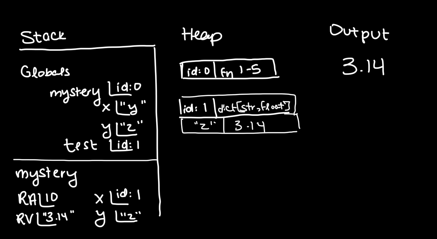- Function mystery points to a function definition on the Heap spanning lines 1 to 5.