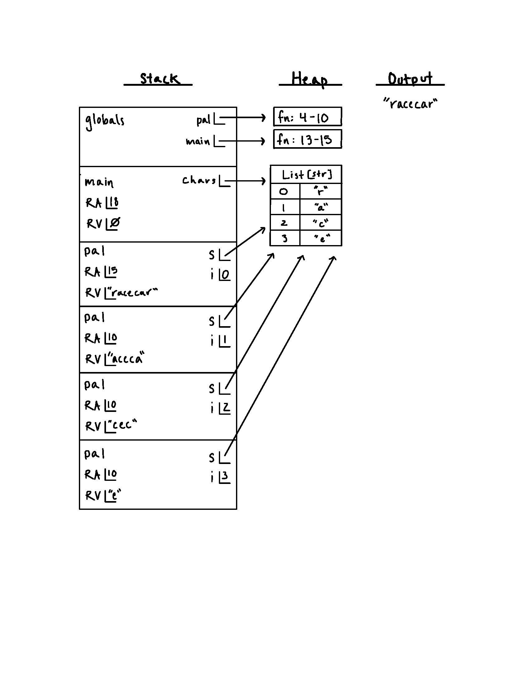 - Remember: Any reference types will live on the heap. To deal with this, we write the variable name in the frame on the stack and then point, or refer to, the data on the heap!