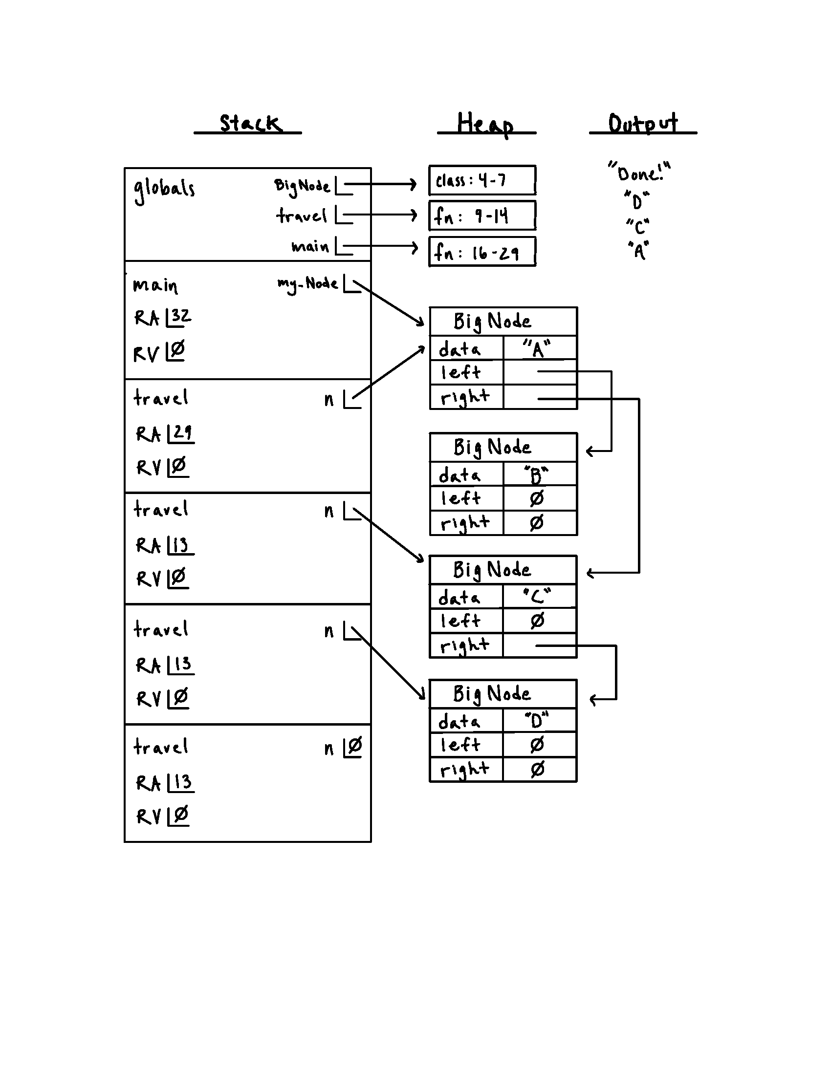- Stack: The program’s “working space.” It consists of a bunch of ‘frames’ that will correspond with each function call. The stack is specifically ordered and follows the same structure as your function calls!
